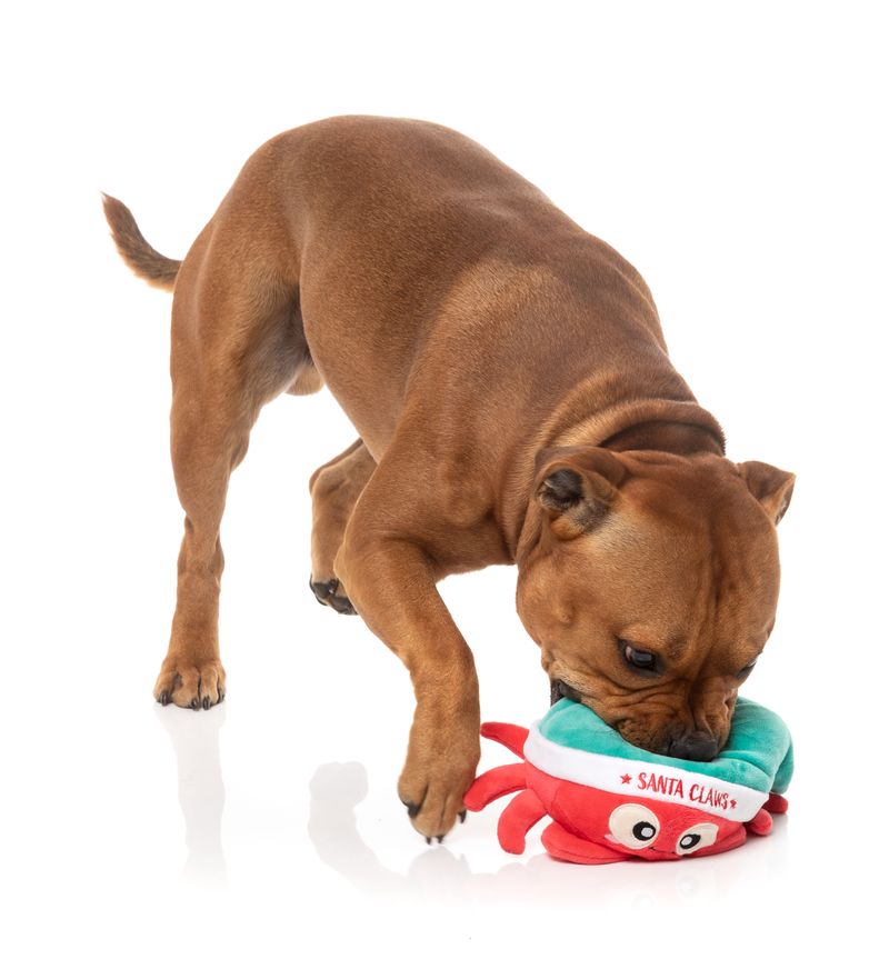 Jouet en peluche ultra-résistant en forme de crabe avec bonnet de Père Noël, équipé d’un pouic-pouic. Corps rond et dodu, idéal pour jouer, mordiller ou décorer.